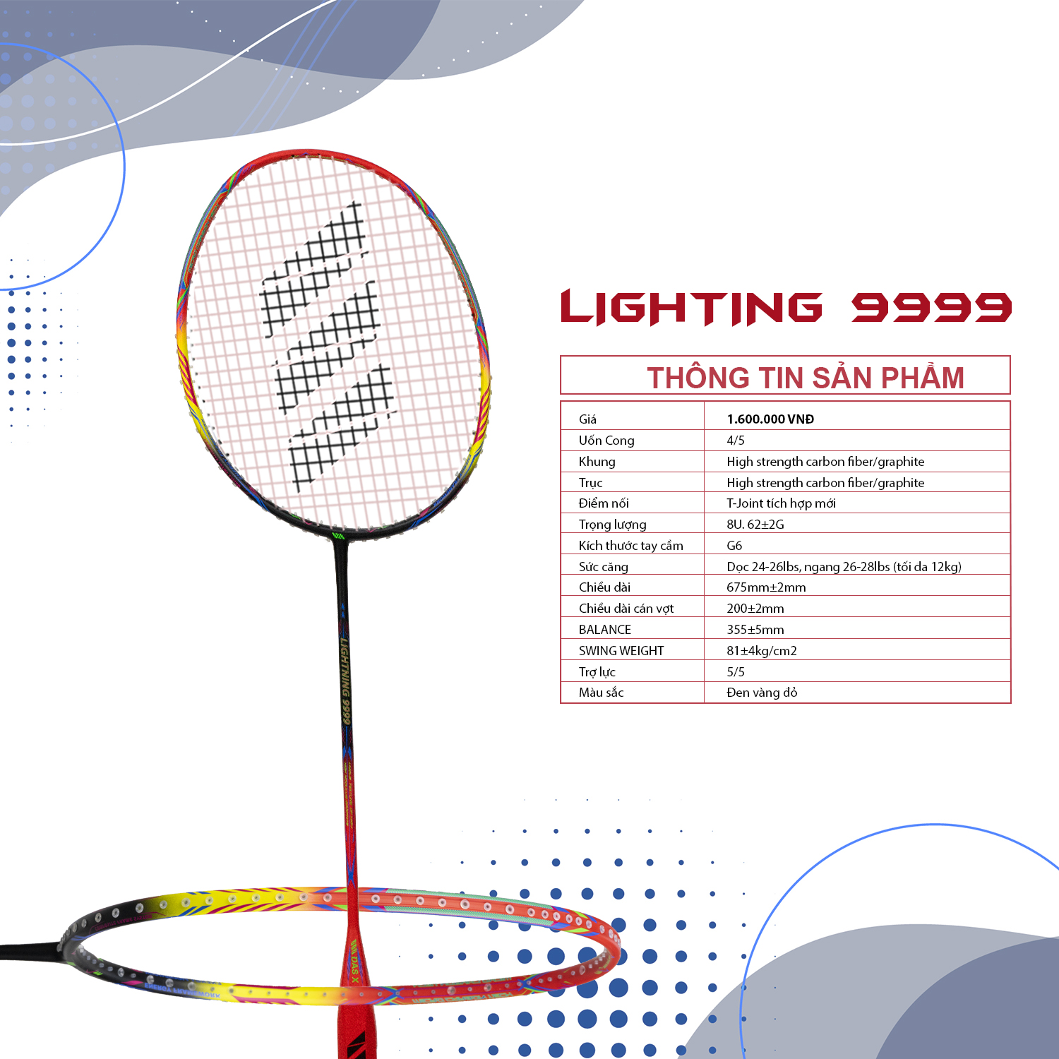 - Sức căng: Dọc 24-26LBS, ngang 26-28LBS (tối đa 12KG)
