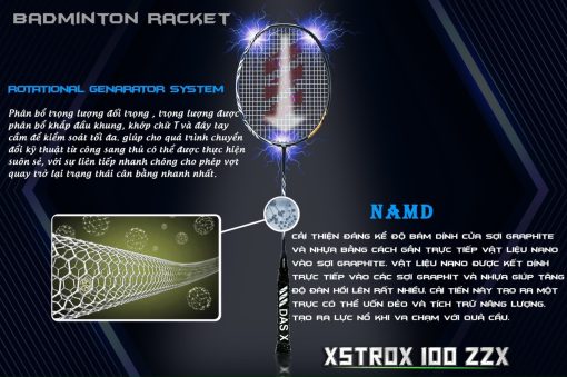 – Namd: vật liệu nano được kết dính trực tiếp vào các sợi graphit và nhựa được tăng lên rất nhiều. Tạo ra một trục có thể uốn dẻo và tích trữ năng lượng, tạo ra lực nổ khi va chạm với quả cầu